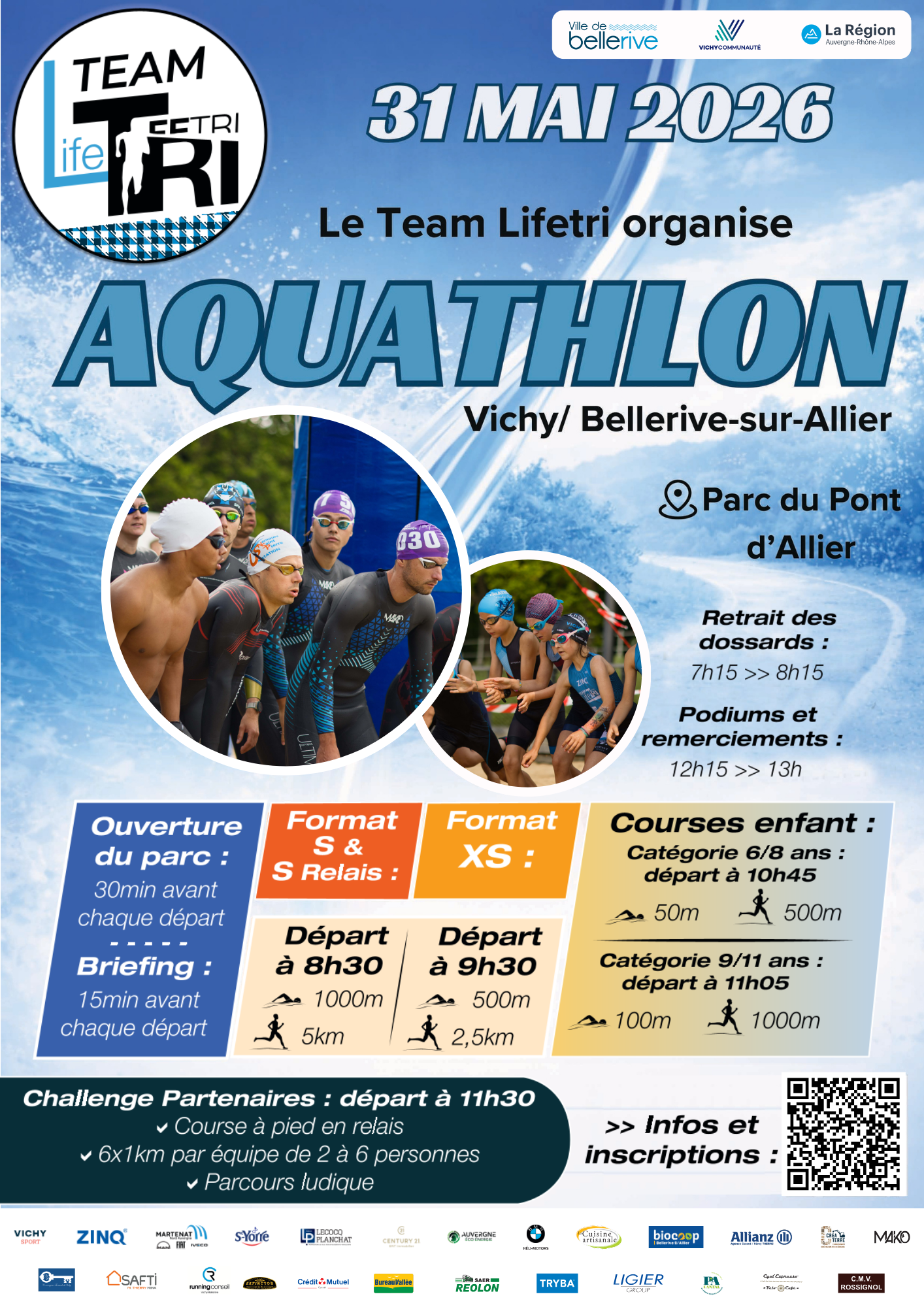- Parcours enfants, adaptés aux différentes catégories d’âge pour initier les plus jeunes au plaisir de l’aquathlon dans un cadre sécurisé.