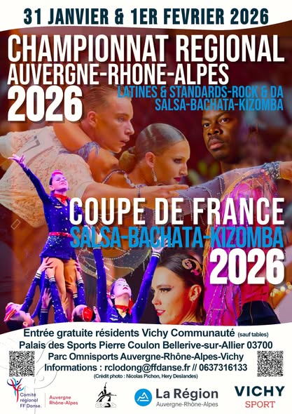 Le Championnat Régional Auvergne-Rhône-Alpes 2026 (Latines & Standards, Rock & Disciplines Associées, Salsa/Bachata/Kizomba) le samedi 31/01,