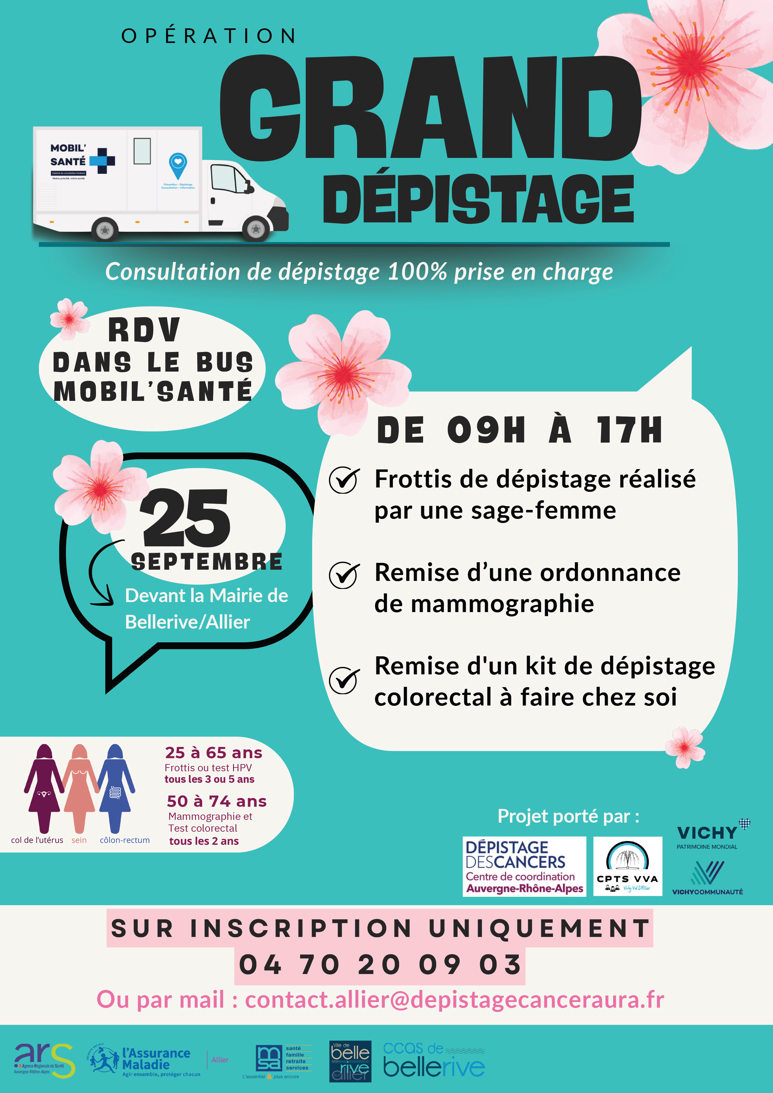 L’opération Grand dépistage se déroulera le jeudi 25 septembre 2025, de 9 à 17 heures, sur l’Esplanade François-Mitterrand à Bellerive-sur-Allier !