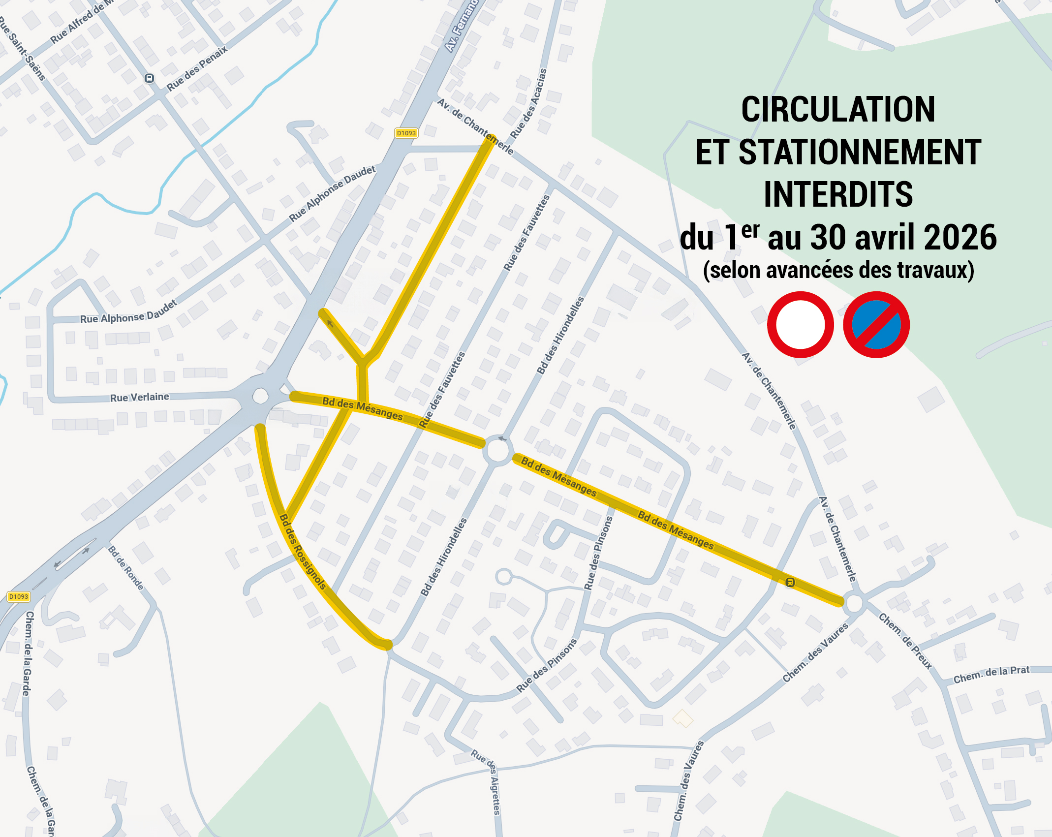 er au 30 avril 2026, les rues des Chardonnerets, Alouettes et Boulevards des Mésanges et des Rossignols sont fermés à la circulation (sauf riverains). Au droit du chantier, le stationnement est interdit.